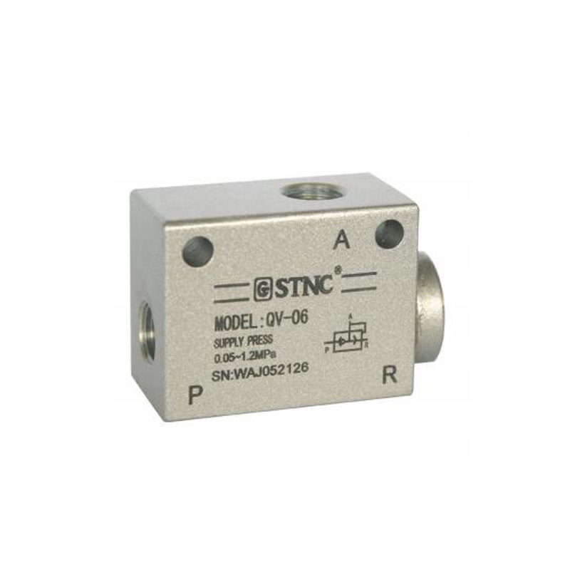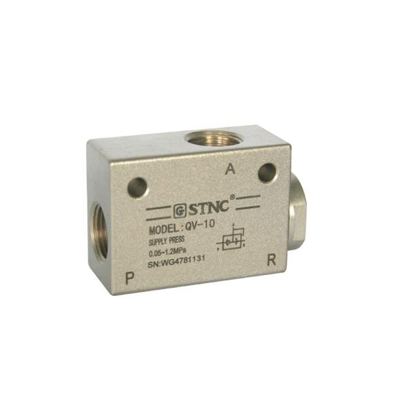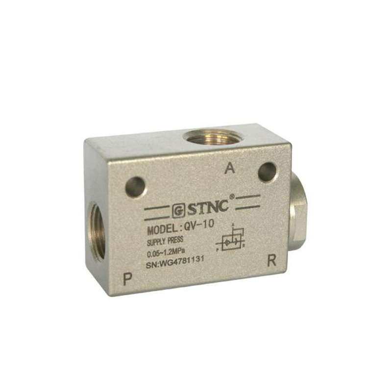 特性:本系列产品是单向型辅助元件,可将系统中工作过的压缩空气快速排放。一般配置在气缸和换向阀之间,使气缸内的气体不通过换向阀快速排放。用于使气动元件或装置快速排气的场合。