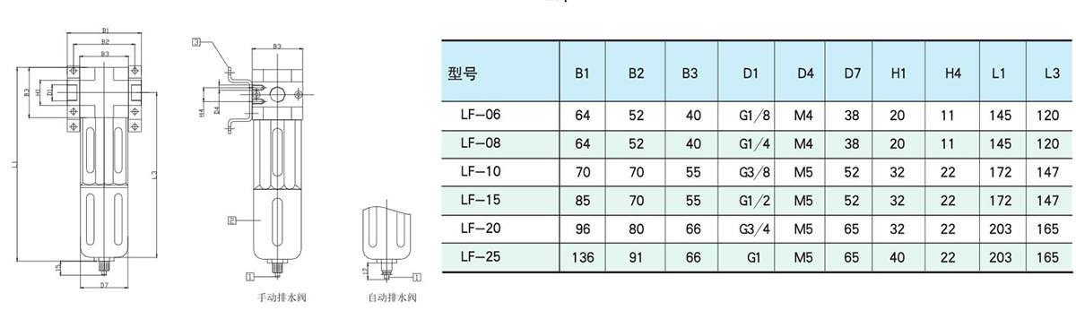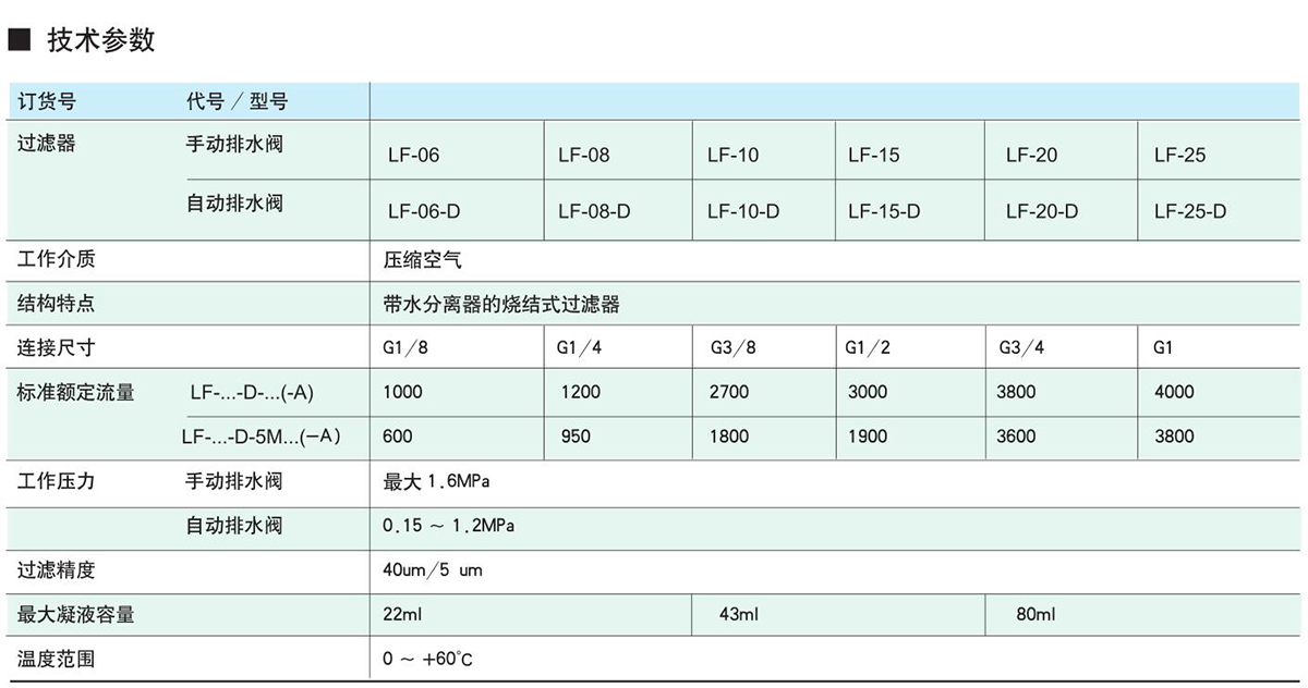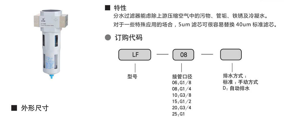 特性:分水过滤器能考虑上游压缩空气中的污物、管垢、铁锈及冷凝水。对于一些特殊应用的场合,5um滤芯可很容易替换40um标准滤芯。